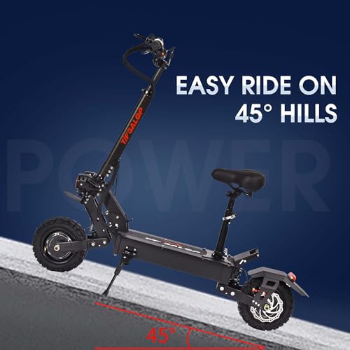 The T108 electric scooter features high-powered front and rear independent motors. With dual front and rear drives, it can reach an impressive speed of 50 mph. The 11-inch dedicated off-road tires offer enhanced stability and performance on various terrains.