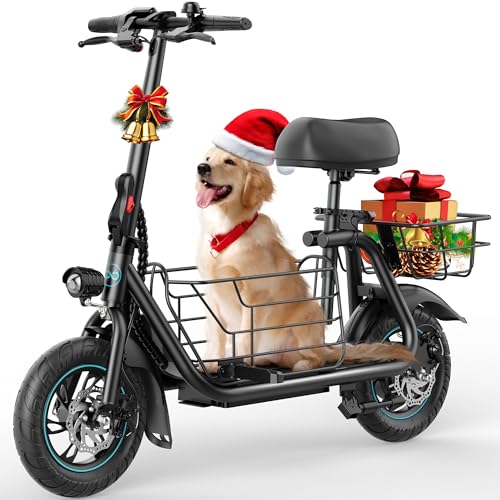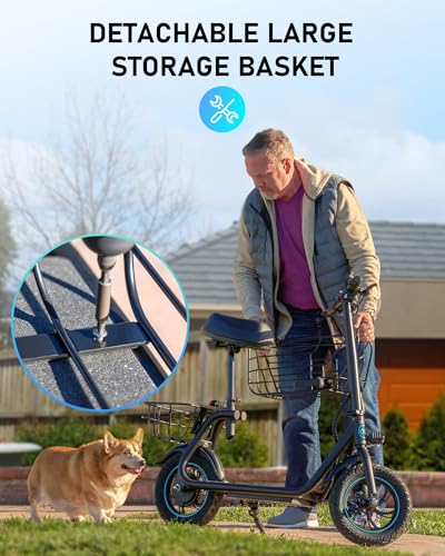 Our scooter comes with a large, detachable basket in the middle and a smaller one at the rear, perfect for effortless transport of larger items. The 9.5-inch deck offers ample space for your feet or a small pet. Equipped with robust 12-inch shock-absorbing tires, you’ll enjoy a smooth, comfortable ride.