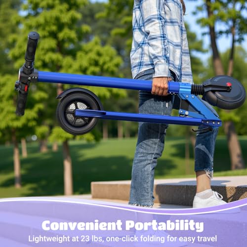 The Caroma electric scooter comes 90% assembled and is designed for convenience. The electric scooter for kids ages 8-12 features a fast-folding mechanism, allowing it to fold within 3 seconds. With dimensions of 41.7″x15″x12.6″ when folded, it’s easy to take in the trunk of your car, on a bus, or the subway.