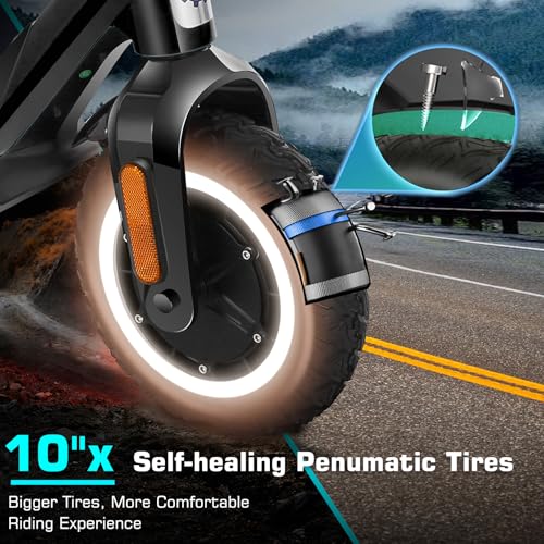 Safety and Comfort: Featuring bright front headlights, automatic tail lights, and safety turn signals, this e-scooter ensures safe rides even in low-light conditions. Its electronic handbrake and disc brake system provide reliable stopping power. The 10-inch self-healing inflatable tires offer a comfortable ride.