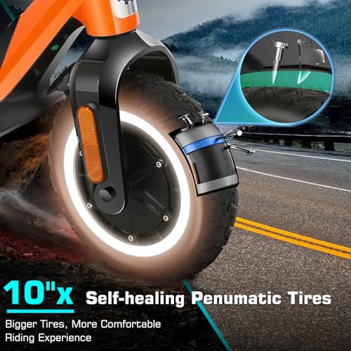 Ride safely and comfortably with the CAROMA electric scooter. It boasts bright front headlights, automatic tail lights, and safety turn signals, ensuring visibility even in low-light conditions. The electronic handbrake and disc brake system provide reliable stopping power, while the 10-inch self-healing inflatable tires offer a smooth and comfortable ride.