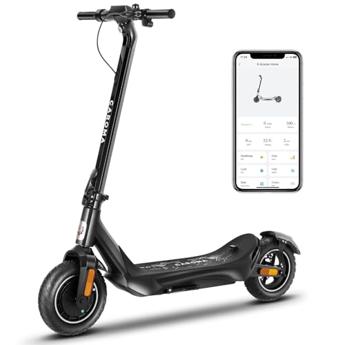 Safety and Comfort: The CAROMA electric scooter is equipped with bright front headlights, automatic tail lights, and safety turn signals, ensuring safe rides even in low-light conditions. Its electronic handbrake and disc brake system provide reliable stopping power. The 10-inch self-healing inflatable tires offer a comfortable and smooth ride.