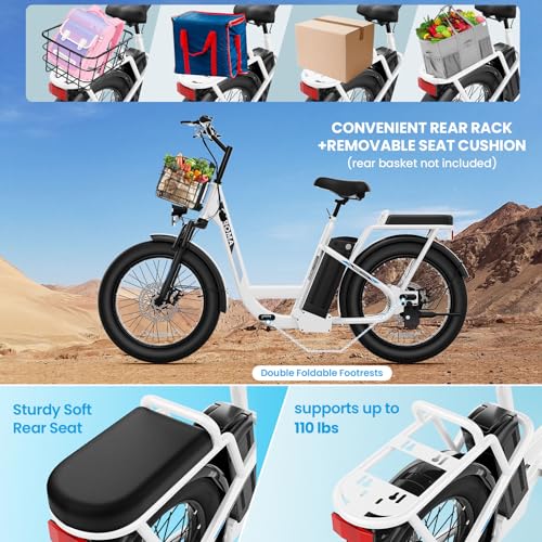Comfortable Riding Experience: A fully adjustable seat allows riders of different heights to find the most suitable riding position for ultimate comfort and control. The step-through design makes it effortless to get on and off the e-bike, and the sturdy rear rack is perfect for carrying groceries, bags, or any gear.
