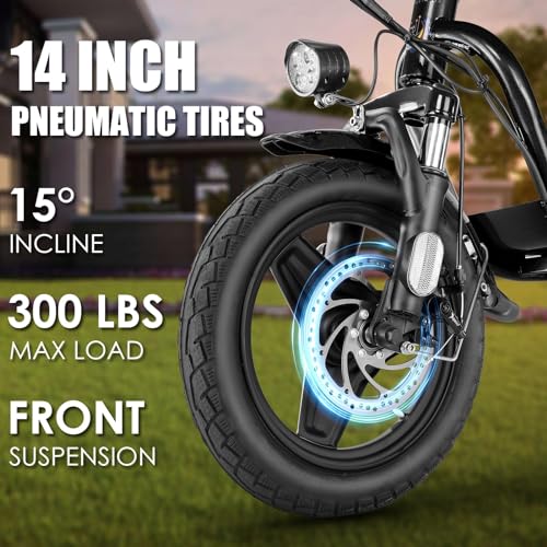 Featuring multiple shock absorptions (front, rear suspension, and seat shock), this scooter significantly reduces shocks and ensures a more comfortable ride. Large 14″ fat tires provide excellent grip, high elasticity, and wear resistance.