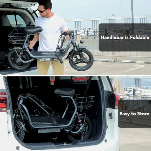 Includes a basket above the rear wheels, capable of carrying up to 30 pounds. The LCD display shows real-time power levels, allowing you to monitor your ride’s performance. The handle-mounted throttle allows precise speed control.