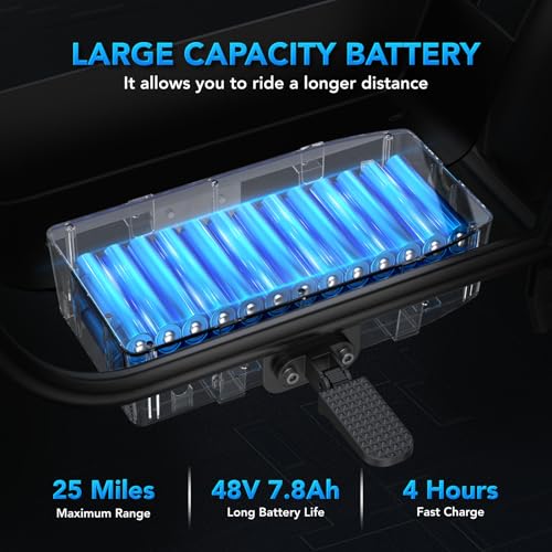 • Impressive Range: The 48V 375Wh UL 2272 certified battery offers a 25-mile range with fast 4-6 hour charging. Ideal for daily commutes and leisure rides.