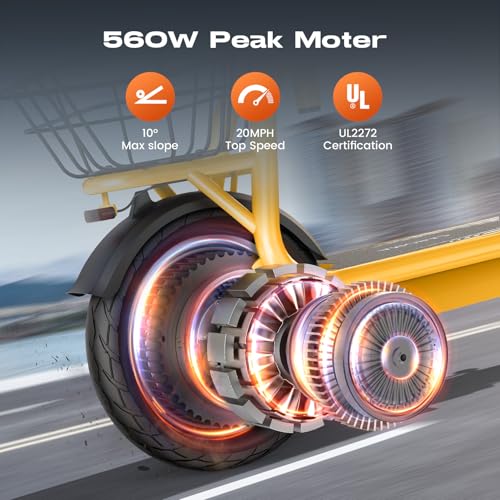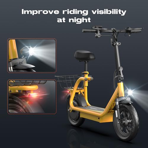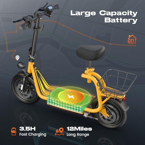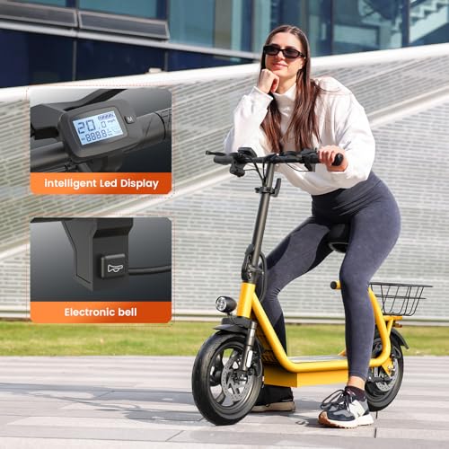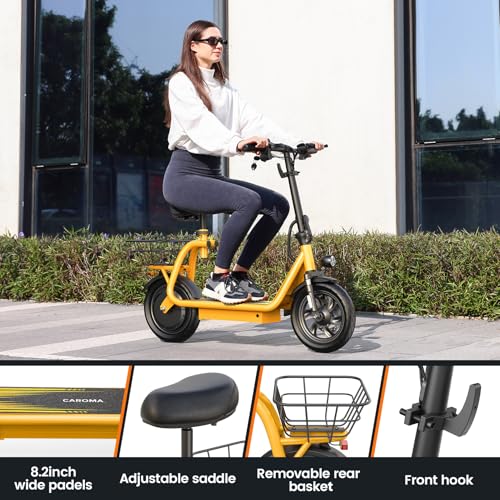 The Caroma scooter has a spacious 8.27-inch wide deck, a 12″ pneumatic tire design, and a soft, adjustable seat. It also comes with a convenient storage basket on the back seat. The front of the vehicle is foldable, making it easy to store in a car trunk or other small spaces.