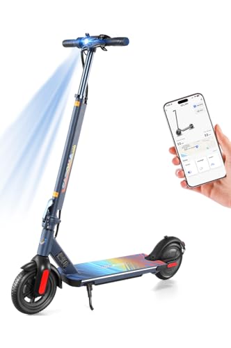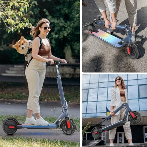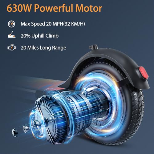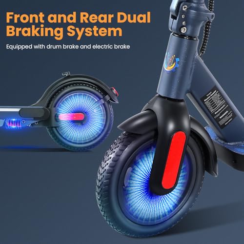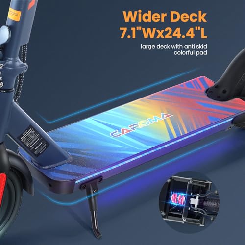 This electric scooter comes with a height-adjustable handlebar that can be set between 40″ and 46″. This makes it suitable for both adults and teens. The 7.1″W x 24.4″L wide deck offers plenty of space for a comfortable ride. Equipped with 9-inch solid tires and a rear shock absorber system, it ensures a smooth and comfortable experience on all terrains.