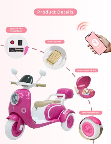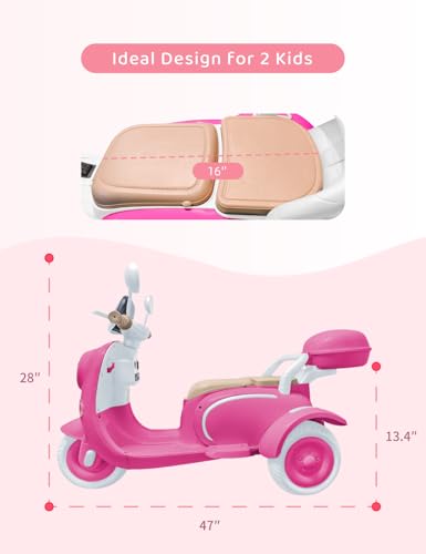 Girls’ 12V Electric Motorcycle, 2 Seats with Storage, Stable 3-Wheel, Rose (Dual Motor)