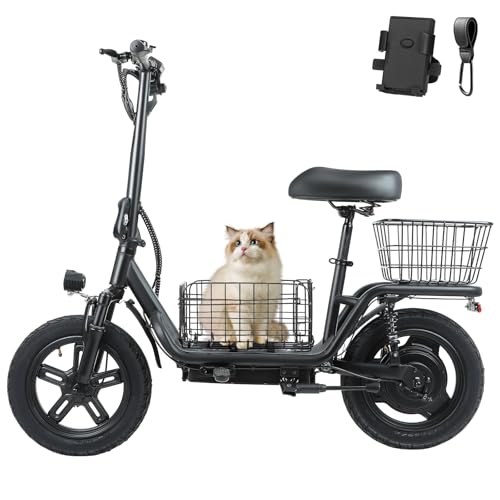 This electric scooter with a seat features a large removable middle basket and a small rear basket, perfect for storing a variety of groceries and pet essentials. The foldable footrests ensure comfortable placement of your feet.
