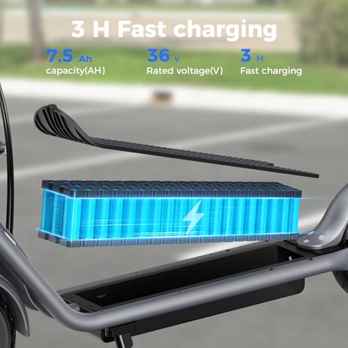 The JS2 electric scooter comes with a 270Wh large battery that boasts an impressive range of 25 miles. Along with 10-inch maintenance-free tires, it’s perfect for daily commutes or leisurely rides. The fast-charging function reduces charging time to 3-5 hours.